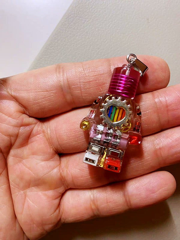 The creation of each pendant begins with a deep dive into discarded technology — we source broken circuit boards, obsolete devices, and loose electronic components like wires, capacitors, and micro-gears. Each part is carefully selected by hand based on texture, form, and symbolic value.