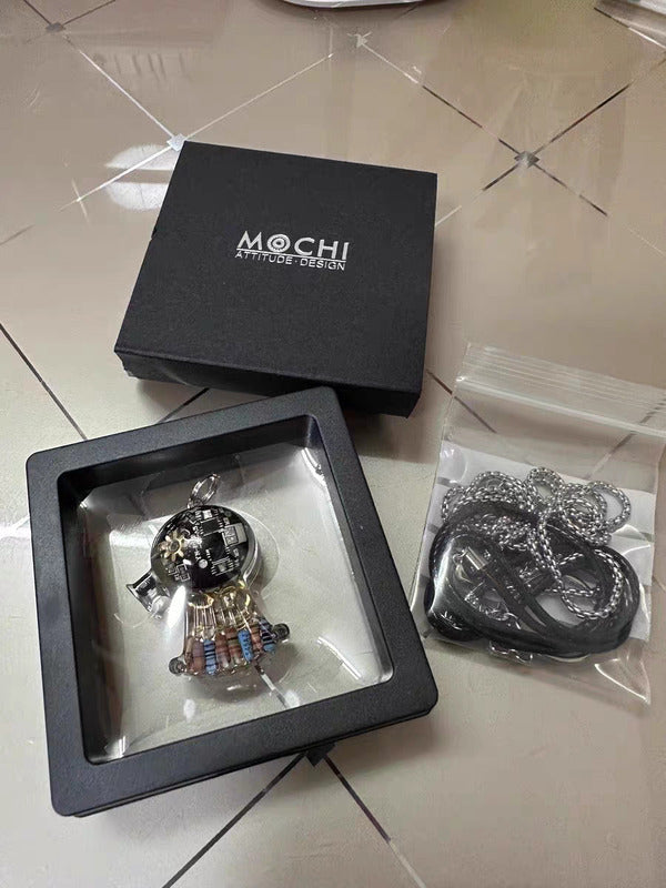 The creation of each pendant begins with a deep dive into discarded technology — we source broken circuit boards, obsolete devices, and loose electronic components like wires, capacitors, and micro-gears. Each part is carefully selected by hand based on texture, form, and symbolic value.
