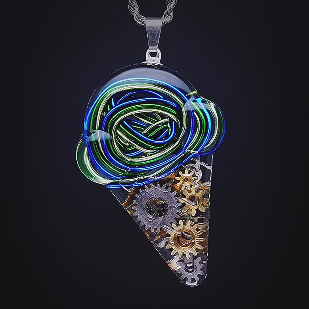 But more than function, resin gives the pendant its identity: it transforms fragile waste into a solid, wearable form — like turning scattered thoughts into a preserved memory. It elevates the rawness of tech trash into something refined and permanent.